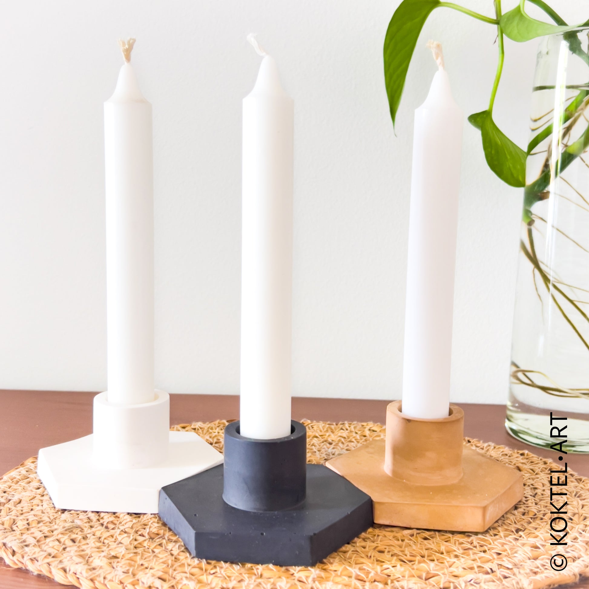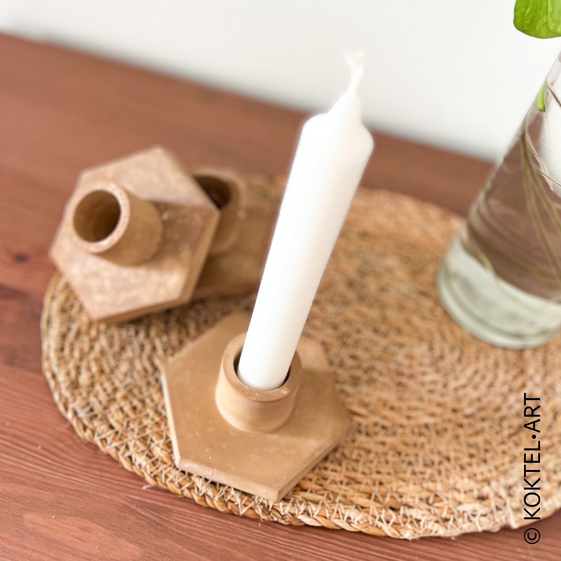 Ilumina tus espacios con nuestro candelabro hexagonal hecho a mano, elaborado con resina ecológica y disponible en marrón, negro o blanco. Cada pieza es única, aportando un toque artesanal, elegante y moderno a tu hogar.