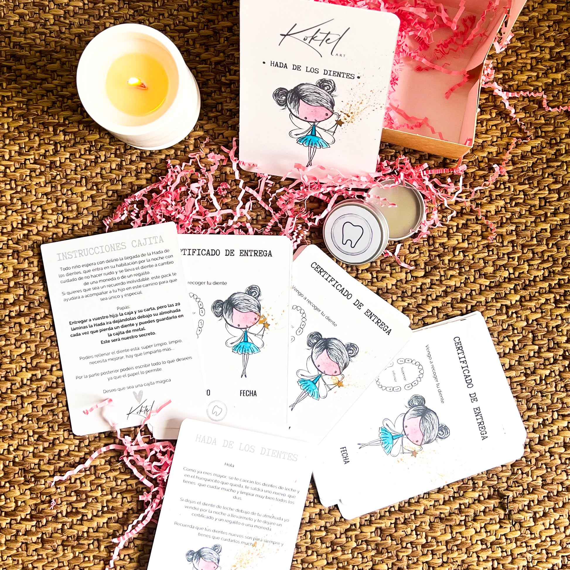 Las 20 láminas serán un secreto entre vosotros y el Hada: ella irá dejando una debajo de la almohada cada vez que se caiga un diente. Podréis guardarlas todas dentro de la cajita metálica, creando un precioso recuerdo de infancia lleno de magia.