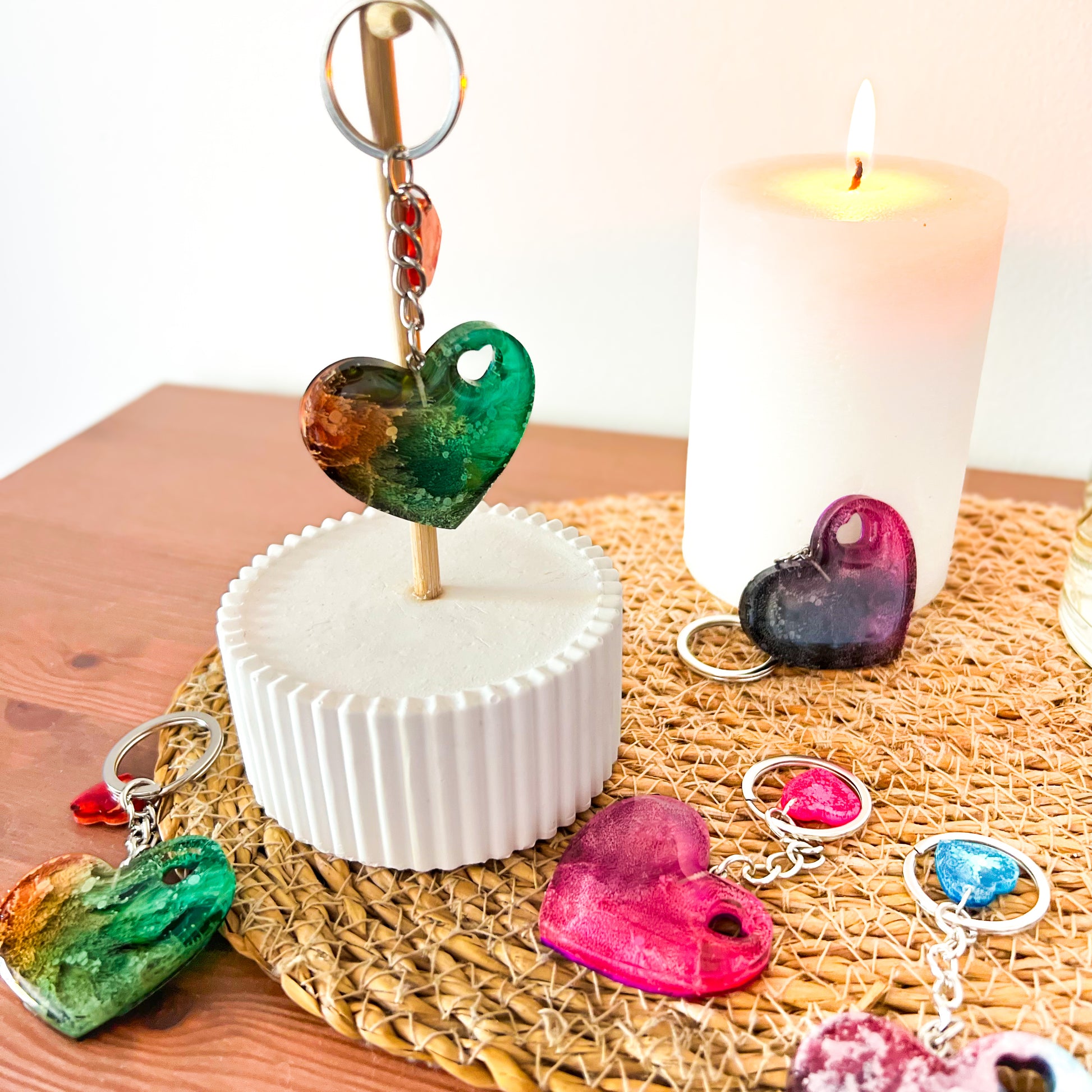 Gracias a la versatilidad de la resina, cada llavero puede incorporar colores y formas, creando diseños alegres y llenos de vida. Cada llavero es distinto, con una combinación de colores diferente, convirtiéndolo en un objeto realmente único.