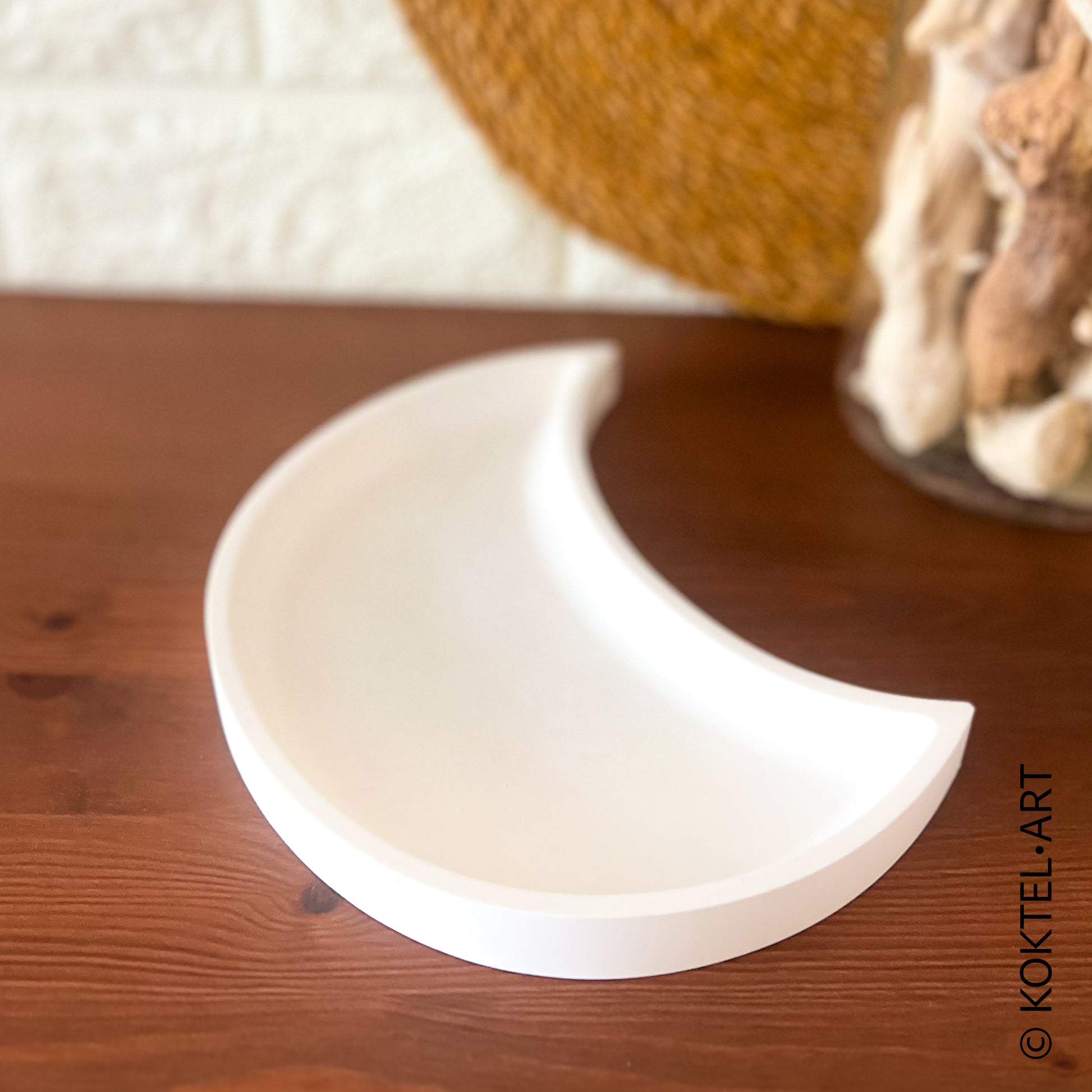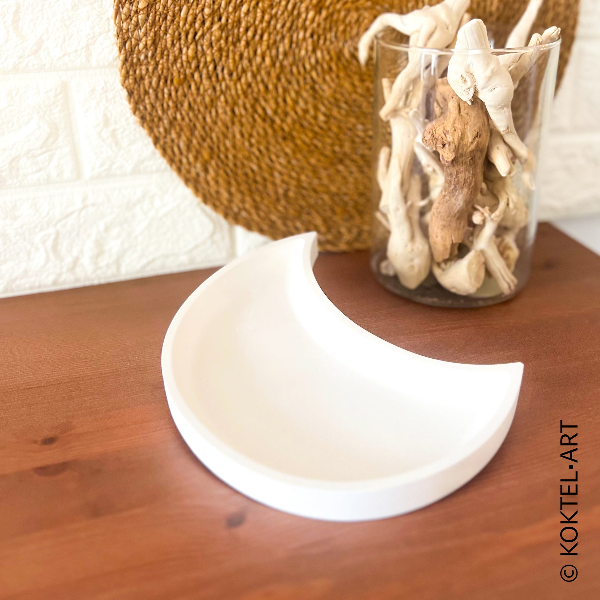 Decora tus espacios con nuestra bandeja Moon, hecha a mano con resina ecológica y acabada en un elegante color blanco mate.