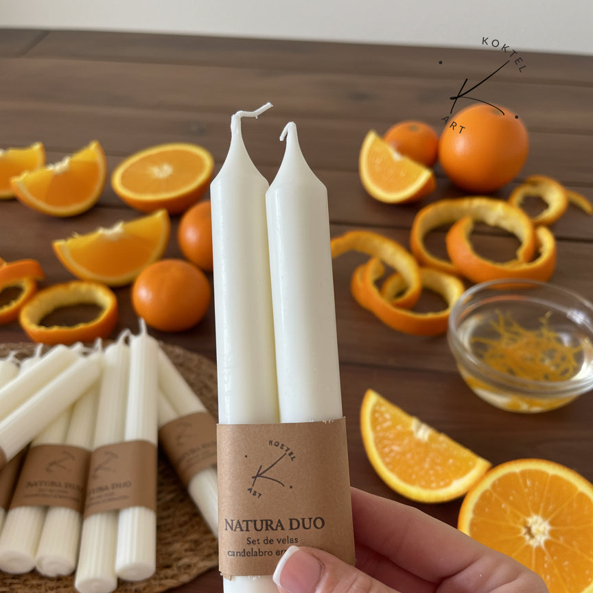 Incluye: dos velas candelabro Natura Duo hechas a mano con cera de soja natural.