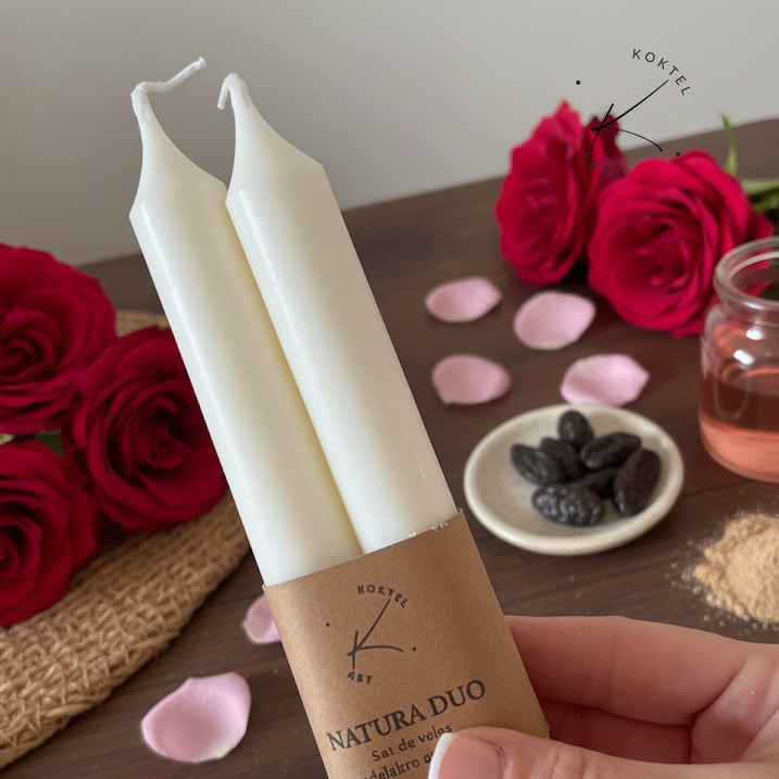 Incluye: dos velas candelabro Natura Duo hechas a mano con cera de soja natural.