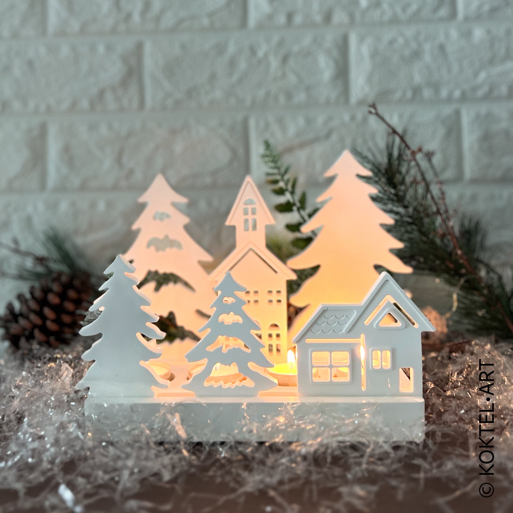 Crea un ambiente mágico estas fiestas con nuestro paisaje navideño hecho a mano, elaborado con resina ecológica en acabado blanco. Incluye 4 velas para iluminar tu escena y llenar tu hogar de calidez, estilo y encanto navideño.